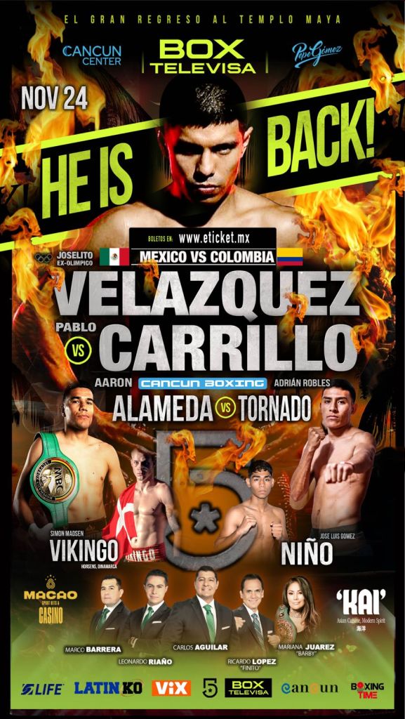 En una importante producción conjunta que ofrecen las empresas “Cancún Boxing”, que preside Pepe Gómez; “Latin KO Promotions”, dirigida por Oswaldo Kuchle; y “Boxing Time Promotions”, a cargo de Guillermo Rocha, el “Huracán” cancunense Joselito Velázquez realizará su retorno a este destino tras poco más de seis años de ausencia.
