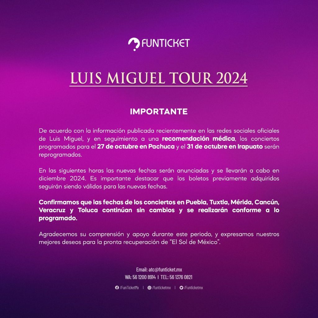 México, 31 de octubre de 2024 — Ante la gran expectativa generada por el regreso de Luis Miguel a los escenarios, nos complace anunciar la reprogramación de sus presentaciones del 27 de octubre en Pachuca y 31 de octubre en Irapuato, cuyas nuevas fechas serán 03 diciembre en Pachuca y 05 diciembre en Irapuato.