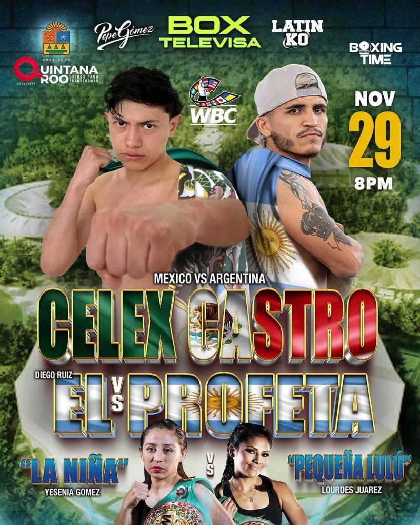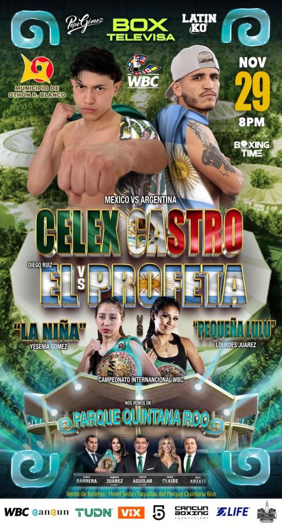 La recién estrenada Arena Quintana Roo, ubicada dentro Parque del mismo nombre en la capital del estado, escenificará este viernes 29 de noviembre la gala boxística “México Vs. Argentina” estelarizada por el duelo entre el cancunense Celex “CCO” Castro (18-0-0, 14 nocauts) y el oriundo de Tucumán, Diego “Profeta” Ruiz (24-10-1, 12 nocauts), programado a 10 asaltos en la escala de los Supergallos.